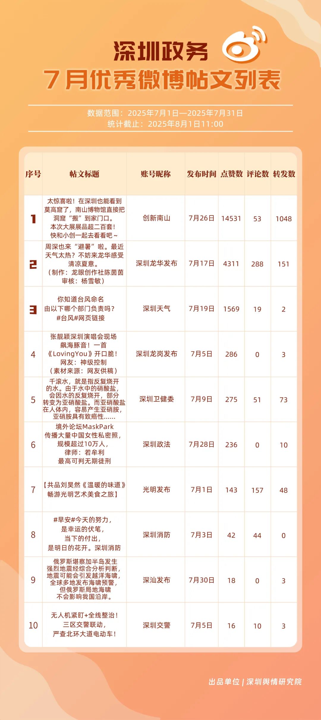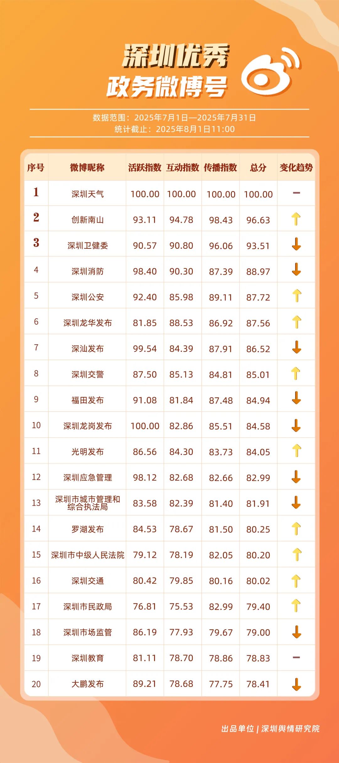 7月,“深圳天氣”“創(chuàng)新南山”“深圳衛(wèi)健委”“深圳消防”“深圳公安”“深圳龍華發(fā)布”“深汕發(fā)布”“深圳交警”“福田發(fā)布”“深圳龍崗發(fā)布”等20個(gè)賬號入選“優(yōu)秀政務(wù)微博號”。其中,“深圳天氣”以活躍、互動(dòng)、傳播指數(shù)三項(xiàng)滿分,蟬聯(lián)榜首;“創(chuàng)新南山”以總分96.63躍居第二,排名呈上升趨勢;“深圳衛(wèi)健委”位列第三,評分也在90分以上,其科普信息持續(xù)獲得市民廣泛認(rèn)可。以上優(yōu)秀的政務(wù)微博賬號精準(zhǔn)貼合平臺的傳播規(guī)律,用獨(dú)特的賬號風(fēng)格展現(xiàn)各自特色與魅力。