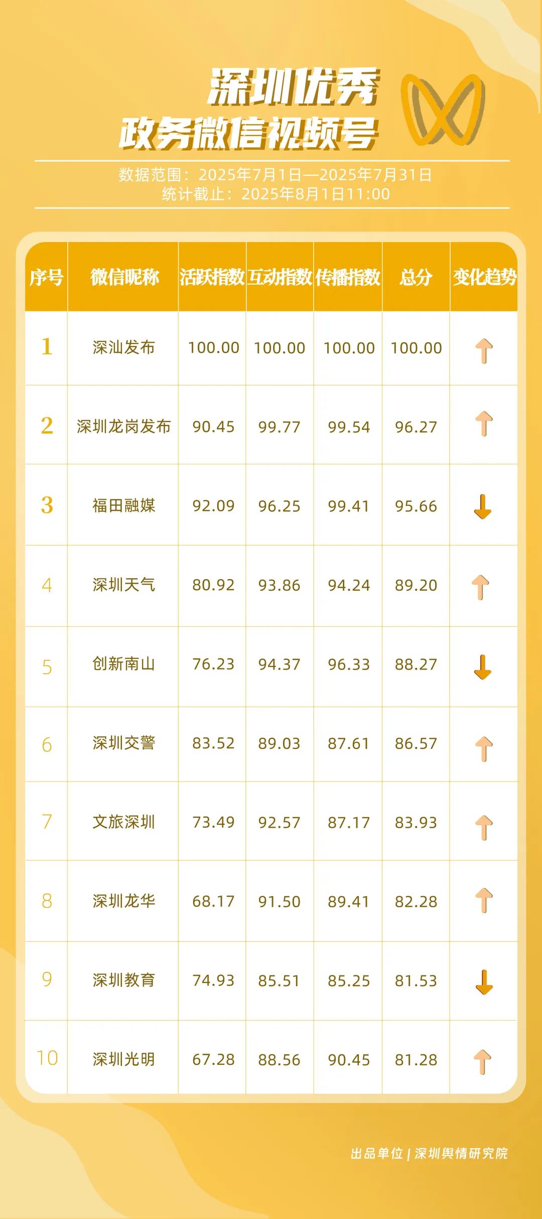 7月,獲得“深圳優(yōu)秀政務(wù)微信視頻號”稱號的是“深汕發(fā)布”“深圳龍崗發(fā)布”“福田融媒”“深圳天氣”“創(chuàng)新南山”“深圳交警”“文旅深圳”“深圳龍華”“深圳教育”“深圳光明”。其中,“深汕發(fā)布”持續(xù)輸出熱點(diǎn)內(nèi)容,收獲大量網(wǎng)民關(guān)注、互動(dòng),三項(xiàng)指標(biāo)均達(dá)滿分,位居榜首;“深圳龍崗發(fā)布”“福田融媒”緊隨其后,總分均超過95分,兩賬號通過多樣化的內(nèi)容呈現(xiàn),在活躍、互動(dòng)及傳播等方面均有出色表現(xiàn);“深圳天氣”“創(chuàng)新南山”“深圳交警”等賬號也獲得不錯(cuò)成績,總分均在85分以上。上榜微信視頻號精準(zhǔn)把握平臺特性,高效傳遞了政務(wù)信息,更成為展現(xiàn)城市活力、拉近政府與民眾距離的重要窗口。