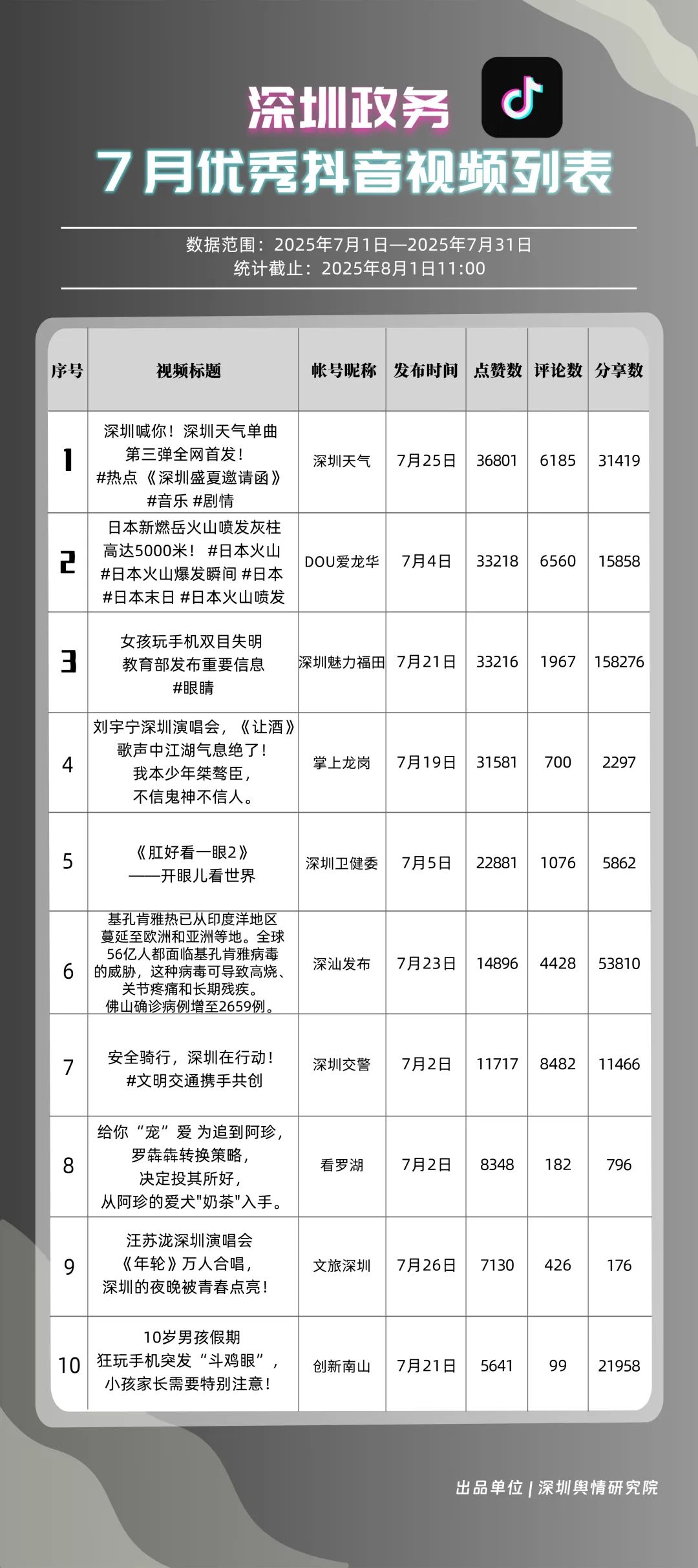 7月,“深圳天氣”“DOU愛龍華”“深圳魅力福田”“深汕發(fā)布”“掌上龍崗”“創(chuàng)新南山”“深圳交警”“文旅深圳”“深圳衛(wèi)健委”“深圳普法”共10個(gè)政務(wù)抖音號獲得“優(yōu)秀政務(wù)抖音號”稱號。其中,“深圳天氣”互動(dòng)指標(biāo)獲滿分,憑借氣象與趣味相結(jié)合的創(chuàng)新科普形式,領(lǐng)跑優(yōu)秀政務(wù)抖音號;“DOU愛龍華”“深圳魅力福田”分別位列第二、三名,通過聚焦網(wǎng)絡(luò)熱點(diǎn)、挖掘創(chuàng)意內(nèi)容,不斷提升傳播效能,展現(xiàn)出強(qiáng)大的政務(wù)新媒體影響力;“深汕發(fā)布”“掌上龍崗”“創(chuàng)新南山”等賬號緊隨其后,上榜的優(yōu)質(zhì)政務(wù)抖音號用短視頻語言強(qiáng)化傳播效果,展現(xiàn)了鮮明的賬號特色和風(fēng)采。
