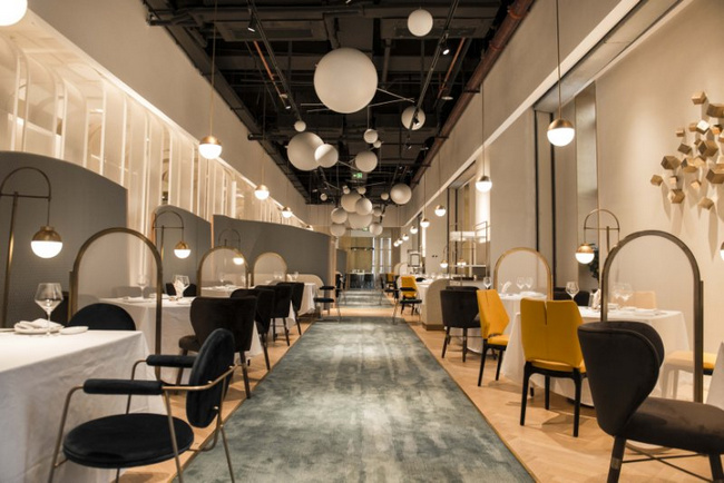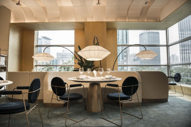 以黑色和金色為主色調(diào)的梧桐PLUS,選用流動的線條對餐廳空間進行分割。桌與桌之間的距離保證了食客對話的私密性和安全性。即使沒有預(yù)定到包廂,也不用擔心旁邊食客的閑聊會影響到彼此。