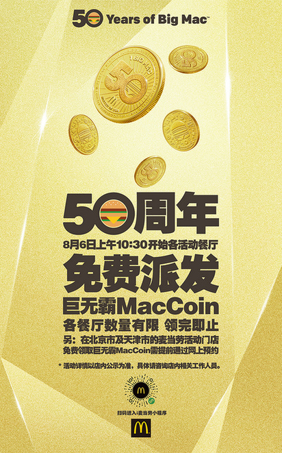 為了與中國消費(fèi)者一起歡慶巨無霸50周年,中國內(nèi)地指定麥當(dāng)勞餐廳將于2018年8月6日當(dāng)日免費(fèi)送出超過100萬枚MacCoin。早上10:30開始,顧客前往餐廳為巨無霸唱出生日歌[ 北京市和天津市的顧客需2018年8月4日上午9:00起在“i麥當(dāng)勞”微信小程序提前預(yù)約,方可于8月6日10:30起在指定麥當(dāng)勞餐廳領(lǐng)取。],即可獲得MacCoin一枚,圖案隨機(jī),送完即止。北京市和天津市的顧客需2018年8月4日上午9:00起在“i麥當(dāng)勞”微信小程序提前預(yù)約,方可于8月6日10:30起在指定麥當(dāng)勞餐廳領(lǐng)取。顧客可以分享與收藏,也可以在2018年12月31日前憑MacCoin在中國內(nèi)地、美國、荷蘭、新西蘭、巴西等全球超過50個(gè)國家和地區(qū)參與活動(dòng)的麥當(dāng)勞餐廳,免費(fèi)兌換巨無霸一個(gè)。