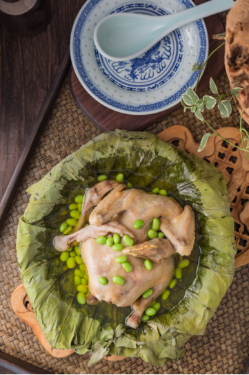 “池塘十里盡荷塘,姊妹朝來采摘忙,不摘荷花摘荷葉,飯包荷葉比花香?!鼻迥┟癯醯倪@首詞,表明了人們對用荷葉制肴的喜好。選用肉質(zhì)細嫩的仔雞,以荷葉包裹蒸熟,松軟適口,呈現(xiàn)原汁原味的鮮美,融合荷葉的幽幽清香,細細品味,仿佛回到夢里水鄉(xiāng)。