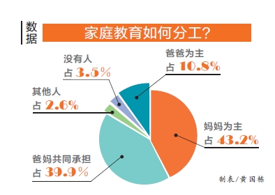 此次調(diào)查中,用14個指標考察家庭教育分工情況,包括:輔導(dǎo)孩子學(xué)習(xí)、培養(yǎng)孩子特長、接送孩子上下學(xué)、開家長會、培養(yǎng)孩子日常行為習(xí)慣、糾正孩子的不良行為、教孩子明辨是非、照顧孩子的飲食起居、和孩子一起游戲及和孩子聊天。統(tǒng)計數(shù)據(jù)顯示,家庭教育分工中,“媽媽為主”的家庭占43.2%,“爸爸為主”占10.8%,“爸媽共同承擔(dān)”占39.9%,“其他人做”占2.6%,“沒有人做”占3.5%。