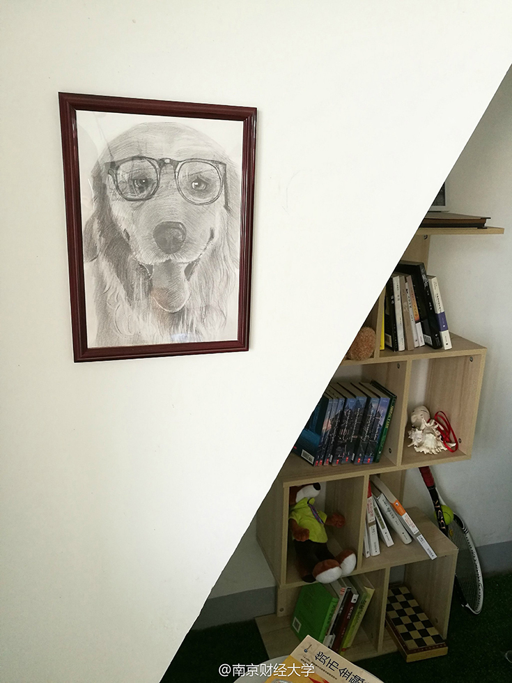 墻上一幅戴著眼鏡的小狗素描圖格外引人注目,它是由602舍長涂貴平親手畫的?!斑@幅畫還是去年自己參加了一個(gè)帶有公益性質(zhì)的畫畫班學(xué)的,我也沒想到能畫成這樣?!眮碜再F州的涂貴平害羞地說,其實(shí)裝飾寢室的初衷很簡單,錢就花了300塊不到,主要是希望大學(xué)四年能住在干凈的環(huán)境。