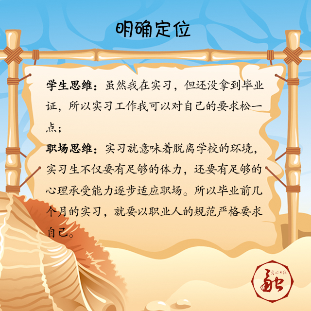 職場思維:實習就意味著脫離學校的環(huán)境,實習生不僅要有足夠的體力,還要有足夠的心理承受能力逐步適應職場。畢業(yè)前幾個月的實習,就要以職業(yè)人的規(guī)范嚴格要求自己。