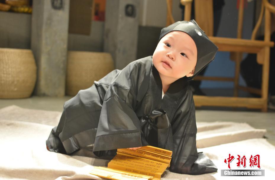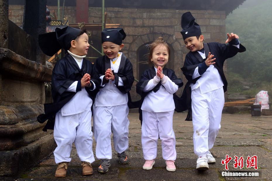 10月16日,在“道教名山”、世界自然遺產(chǎn)地江西上饒三清山,5名來自中外的萌娃身穿統(tǒng)一道服,手持竹簡(jiǎn),在三清宮跟著道教師傅朗讀《道德經(jīng)》、《弟子規(guī)》,學(xué)習(xí)太極拳、書法、古箏等中國(guó)傳統(tǒng)文化。這群萌娃中年齡最小的僅11個(gè)月,年齡最大也只有6歲。程希雪攝
