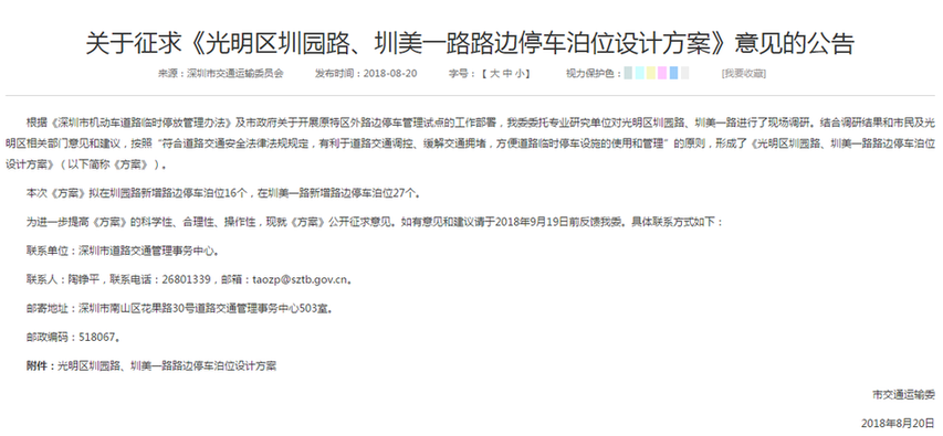 據(jù)介紹,根據(jù)《深圳市機(jī)動(dòng)車道路臨時(shí)停放管理辦法》,按照“符合道路交通安全法律法規(guī)規(guī)定,有利于道路交通調(diào)控、緩解交通擁堵,方便道路臨時(shí)停車設(shè)施的使用和管理”的原則,交通部門(mén)制定了《光明新區(qū)圳園路、圳美一路路邊停車泊位設(shè)計(jì)方案》,擬在圳園路新增路邊停車泊位16個(gè),在圳美一路新增路邊停車泊位27個(gè)。