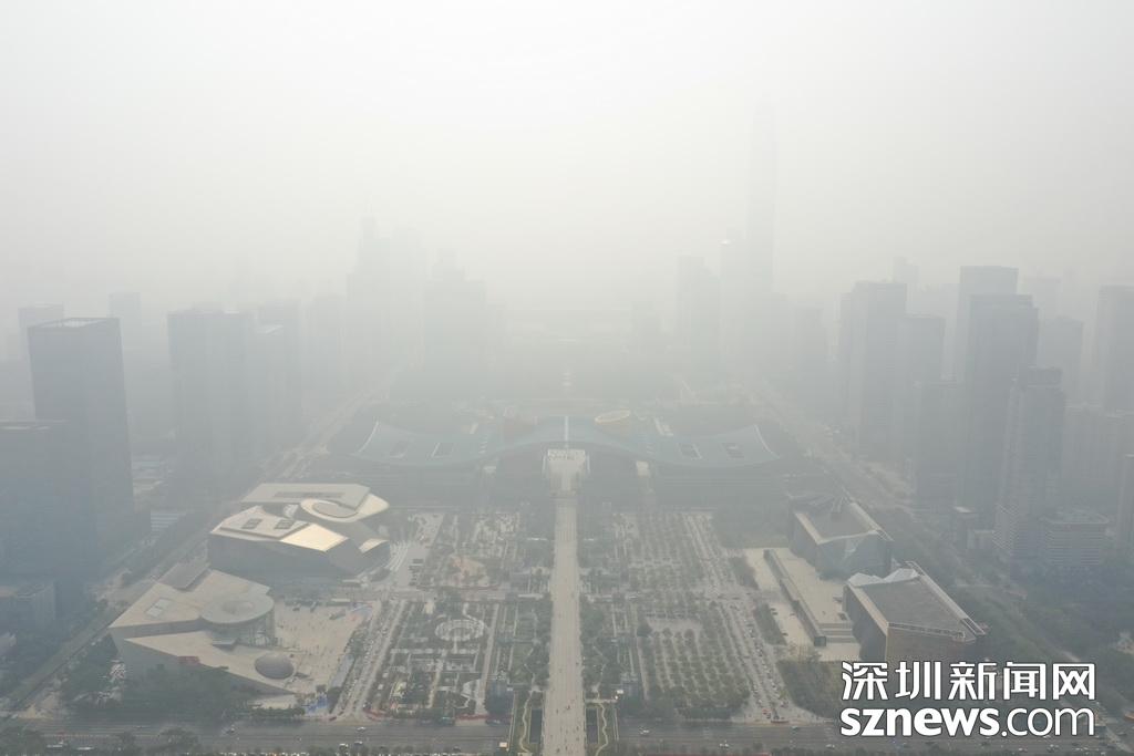 1月12日,霧霾襲深,深圳天氣君發(fā)布預(yù)警,今天最好不要在室外玩耍。記者中午用無人機航拍福田CBD區(qū)域,鏡頭下,市民中心和平安金融大廈兩個地標幾乎無法辨別,新洲路上能見度很低,一切都仿佛浸在化不開的濃湯里。深圳天氣君在微博提醒:弱北風影響下,不利于污染物擴散,我市中西部地區(qū)下午會持續(xù)十面“霾”伏,灰霾黃色預(yù)警信號生效中,各位盡量不要長時間戶外活動。