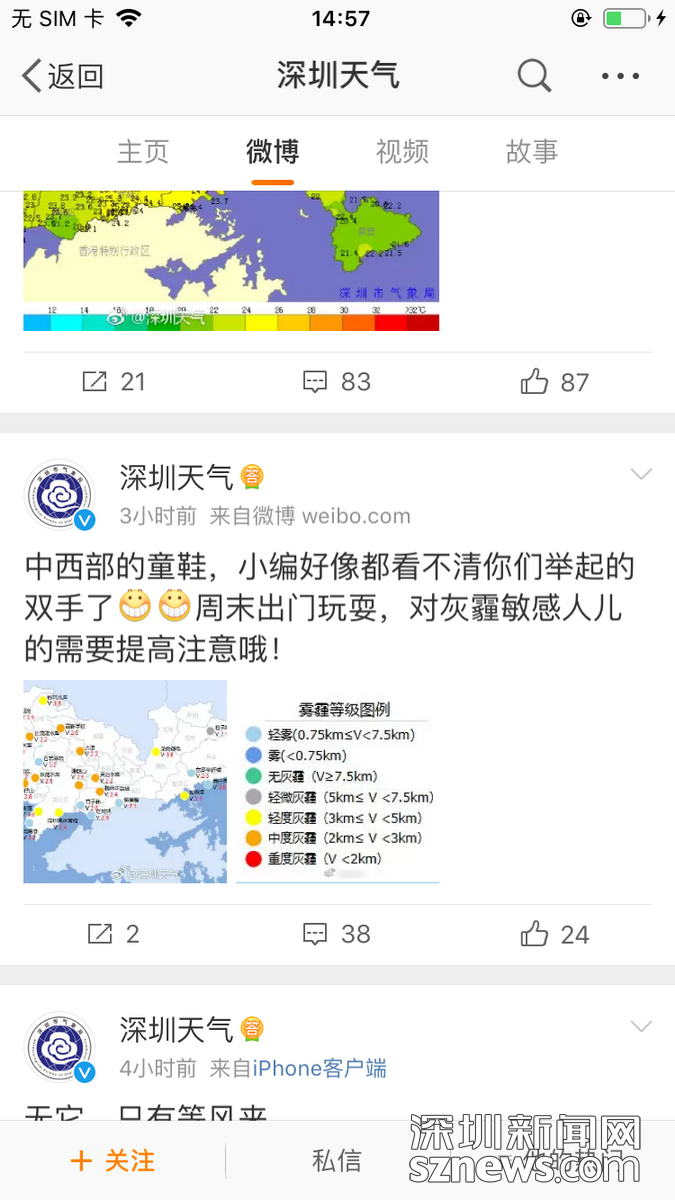 1月12日中午,深圳天氣微博發(fā)布預(yù)警,圖中橙色圓點所在的深圳多個片區(qū)發(fā)生中度灰霾