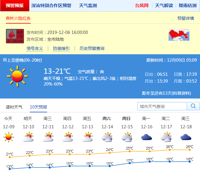 今日起氣溫逐日回升。深圳市氣象臺(tái)預(yù)測(cè),9-11日晴天間多云,空氣非常干燥,氣溫逐日小幅度回升;12-13日晴天間多云,空氣干燥;14-16日,云量增多,濕度增大,氣溫繼續(xù)回升。天氣持續(xù)干燥,請(qǐng)注意用火安全。