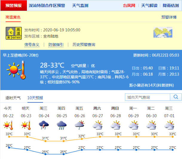 見圳客戶端?深圳新聞網2020年6月22日訊 據深圳氣象局消息,6月22日,深圳晴天間多云,天氣炎熱,局地有短時雷雨;氣溫28-33℃,中北部地區(qū)最高氣溫35℃;南風3級,陣風5-6級;相對濕度60%-90%。