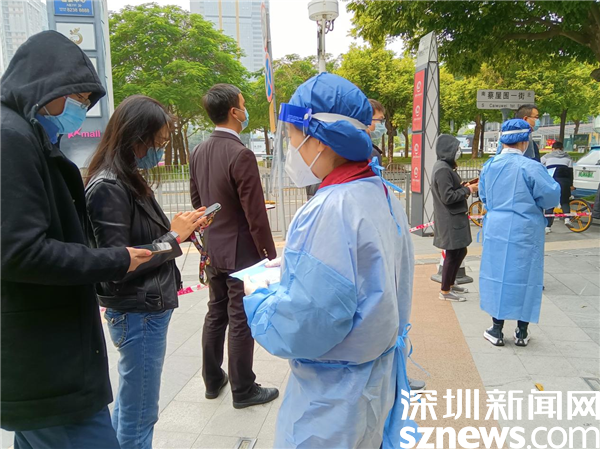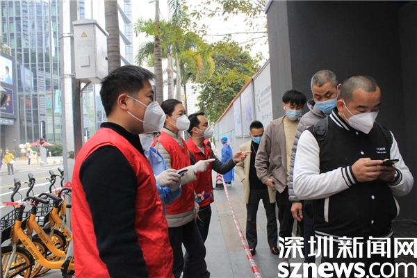 1月14日,深圳市京基智農(nóng)時代股份有限公司總部黨支部黨委副書記張玲帶領(lǐng)5位黨員,火速來到禧程酒店臨時檢測點(diǎn),經(jīng)過簡短的培訓(xùn),他們集體上崗,各就其位。有的維持秩序,有的在外圍協(xié)助查驗綠碼,有的協(xié)助出示粵酸碼。黃子亮和彭乾偉穿上防護(hù)服,現(xiàn)學(xué)現(xiàn)做,使用自己的手機(jī)為前來采用的市民掃描粵酸碼。他們都是青壯年,雖然這是關(guān)鍵崗位,但他們一學(xué)就會,很快上手。十人一管,掃碼上傳,有條不紊,忙而不亂。