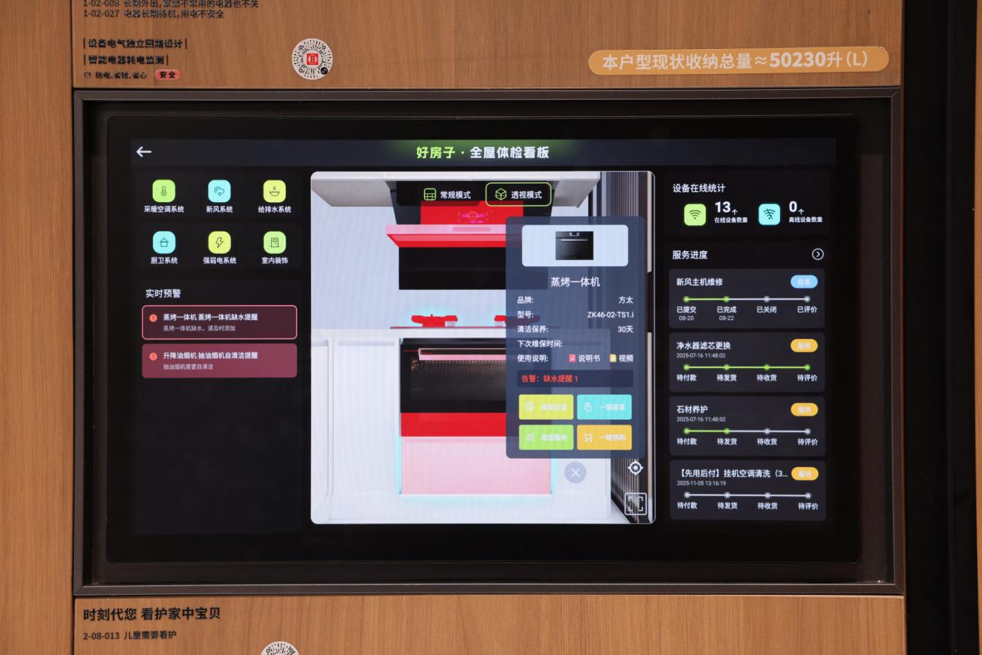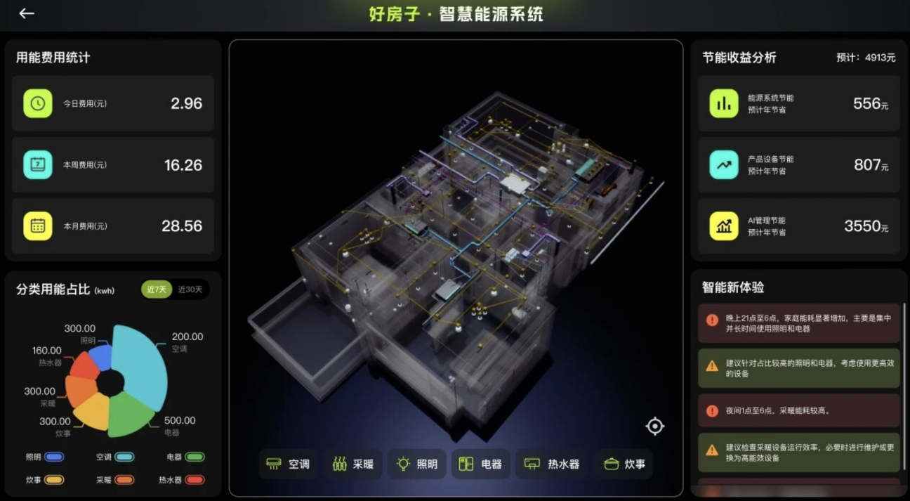 用電安全與能耗優(yōu)化則體現(xiàn)“空間大腦”的貼心之處。家庭智慧能源系統(tǒng)2.0實現(xiàn)用電安全預警、數(shù)據(jù)可視化、能耗分析三大核心功能,通過AI算法提供節(jié)能建議,分回路能耗閾值設定更精準,安全風險實時提醒。而全屋體檢系統(tǒng)更堪稱“房屋說明書”,由華藝設計BIM團隊自主研發(fā),實現(xiàn)設備一鍵自檢、故障一鍵報修、損耗提前預警,讓服務跑在問題前面,完成從技術(shù)革新到服務革命的跨越。