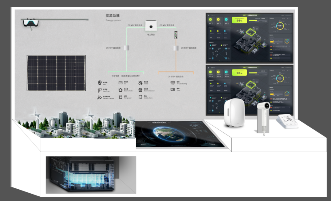 綠色能源技術(shù)是“空間大腦”的核心支撐。響應國家“雙碳”戰(zhàn)略及廣東“新能源產(chǎn)業(yè)高質(zhì)量發(fā)展”部署,華藝設計自研48V+375V雙重直流供電架構(gòu),通過“去逆變器+綠電直用+柔性配電”技術(shù),減少交直流轉(zhuǎn)換損耗,使總體能源利用率提升15%-20%。建筑立面創(chuàng)新性集成光伏建筑一體化(BIPV)系統(tǒng),定制化光伏組件與建筑美學無縫融合,轉(zhuǎn)換效率達21%以上,兼具遮陽、防水、保溫功能,實現(xiàn)“建筑即電站”。配合“發(fā)電-儲電-用電-補能”全鏈路架構(gòu),構(gòu)建起清潔低碳的家庭能源生態(tài)。