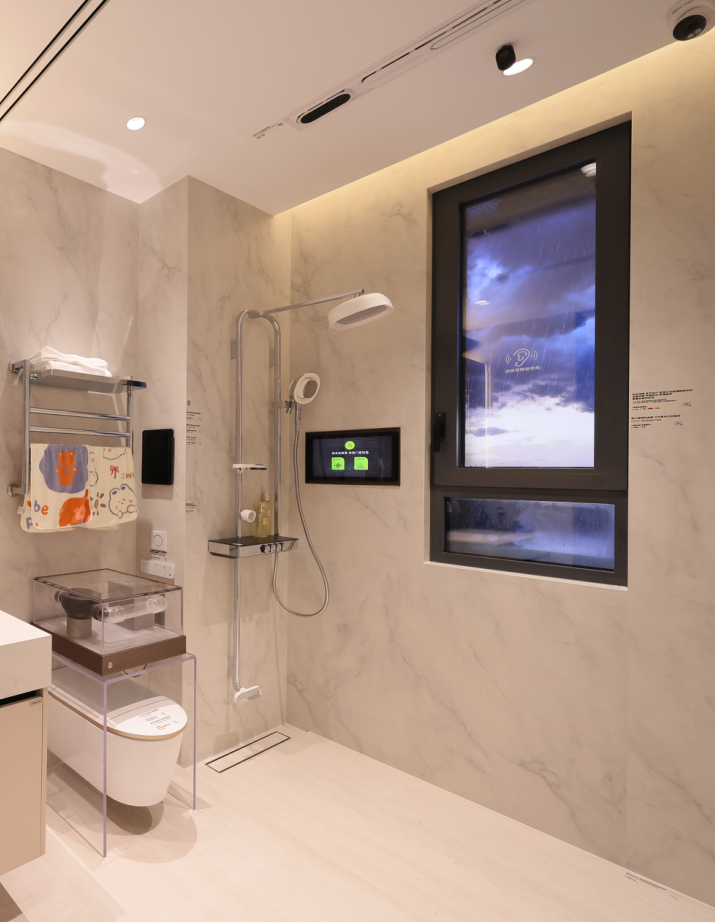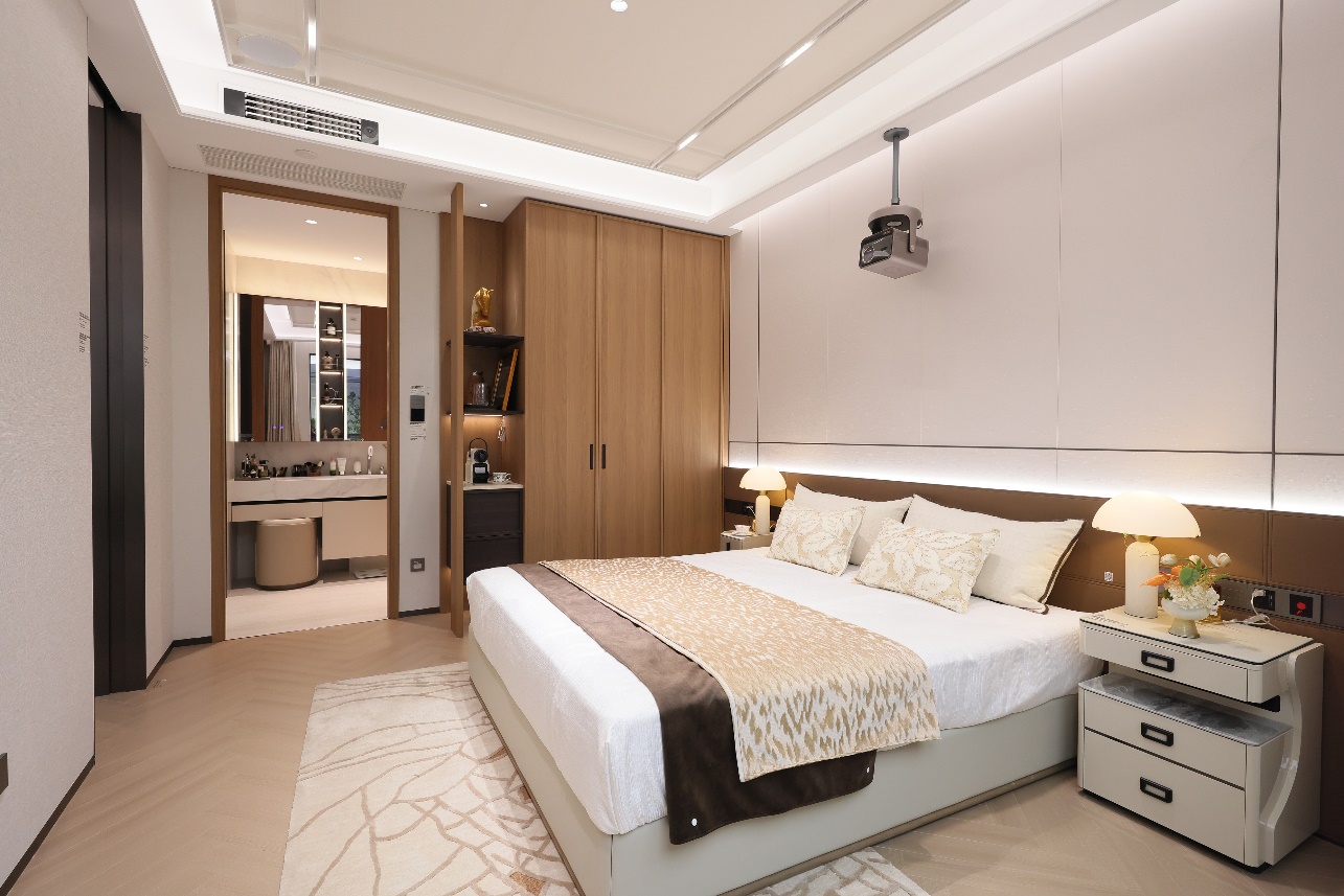 機電系統(tǒng)設計則凸顯“空間本體”的人文溫度。給排水系統(tǒng)采用零冷水、活水、凈水三重保障,實現(xiàn)即開即熱、長效阻垢、水質(zhì)抑菌,搭配靜音排水管道,從用水到排水全維度提升舒適度。暖通系統(tǒng)更具巧思:AI空調(diào)風口通過人體感知智能避吹,精準溫控實現(xiàn)“感知-決策-執(zhí)行”一體化;雙直流薄型新風系統(tǒng)可獨立調(diào)速控制室內(nèi)壓差,配合初效、中效雙重過濾,高效攔截PM2.5,解決回南天室內(nèi)通風難題,打造恒溫恒濕的健康空氣環(huán)境。