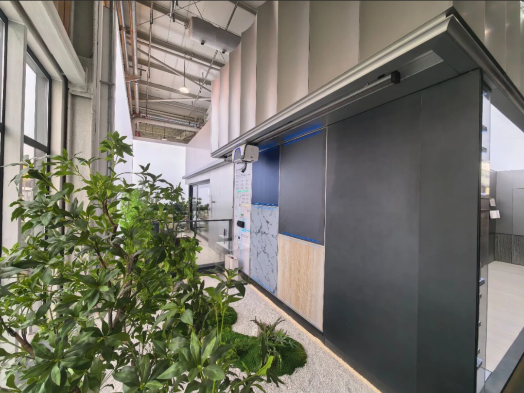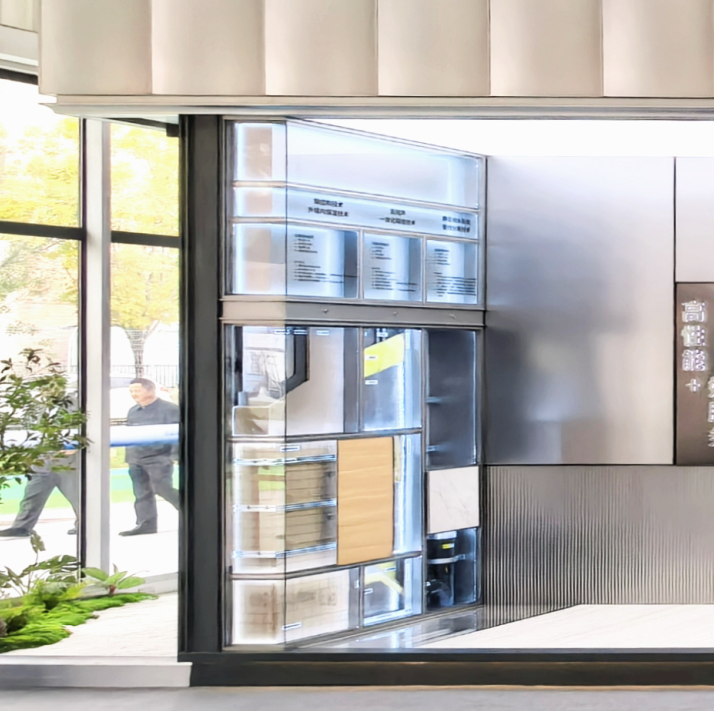 立面設計是“空間本體”的氣質(zhì)表達。設計靈感源自中?!邦I潮”文化,以靈動起伏的線條、純凈材質(zhì)與精致細節(jié),營造出科技感與親和力兼具的內(nèi)斂氣質(zhì)。大塊面少分縫的幕墻設計,不僅提升整體觀感純凈度,更通過嚴苛的加工安裝工藝,彰顯“好房子”的精工品質(zhì)。同時,立面局部墻地面內(nèi)透設計,直觀展示鋼結(jié)構(gòu)、外墻內(nèi)保溫、管線分離、靜音排水、高隔聲一體化隔墻等等先進工藝。門窗隔聲隔熱防水性能演示柜體更可模擬室外雨熱天氣和噪音環(huán)境,讓參觀者親身體驗高標準產(chǎn)品帶來的高品質(zhì)人居環(huán)境。