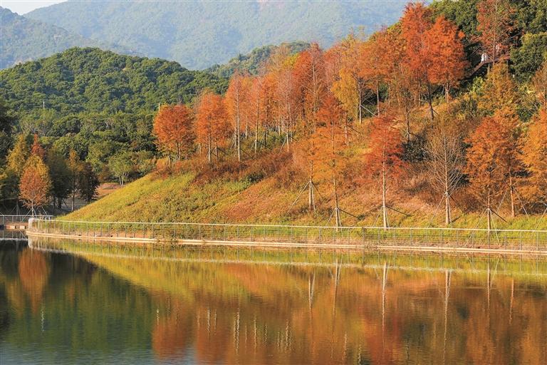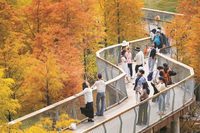 而在龍崗區(qū)紅花嶺低碳環(huán)境生態(tài)園,蜿蜒的空中步道被橙黃交織的落羽杉環(huán)繞,步道上游客舉著手機(jī)拍照,遠(yuǎn)處草坪上還能看到家庭野餐的身影,低碳生態(tài)空間變身人氣打卡地。