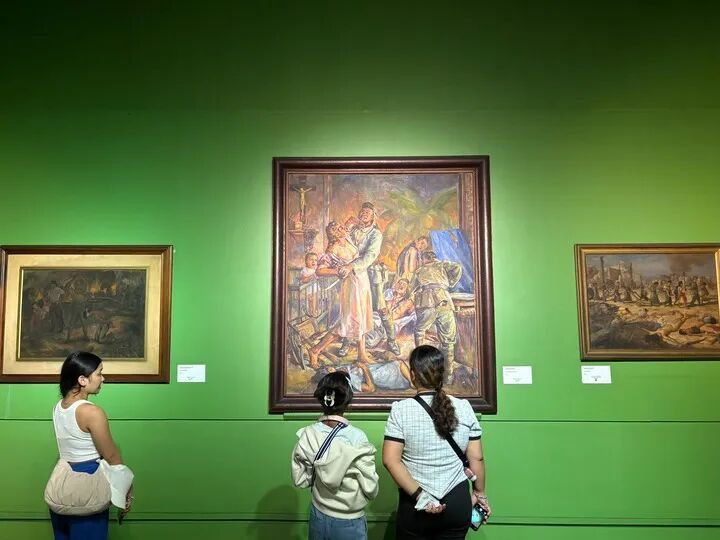 參觀者在菲律賓國家美術(shù)館二戰(zhàn)主題展廳參觀,該展廳陳列著二十余幅描繪日軍暴行的畫作。(新華社記者 張怡晟 攝)
