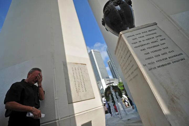 2015年2月15日,一位市民在新加坡美芝路戰(zhàn)爭紀(jì)念公園舉行的祭禮上悼念死難者。當(dāng)日,新加坡中華總商會舉行第48屆悼念日本占領(lǐng)時(shí)期死難人民祭禮。新華社發(fā)(鄧智煒攝)