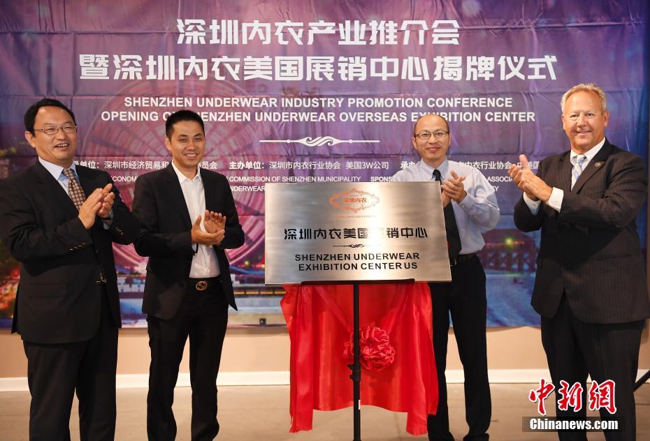 當(dāng)?shù)貢r(shí)間7月17日,深圳市內(nèi)衣行業(yè)協(xié)會(huì)在中美國(guó)際(美東)創(chuàng)業(yè)港——默特爾比奇市Waccoma Center舉行深圳內(nèi)衣產(chǎn)業(yè)推介會(huì)暨深圳內(nèi)衣美國(guó)展銷(xiāo)中心揭牌儀式。中美國(guó)際(美東)創(chuàng)業(yè)港聯(lián)合深圳市內(nèi)衣行業(yè)協(xié)會(huì)為深圳內(nèi)衣品牌進(jìn)駐美東市場(chǎng)搭建綠色通道和產(chǎn)業(yè)孵化平臺(tái),采用“時(shí)尚秀+靜態(tài)展”的形式,促進(jìn)中美內(nèi)衣文化和時(shí)尚的交流。圖為霍里郡議會(huì)主席馬克先生Mark Lazrus(右一)、深圳市經(jīng)濟(jì)貿(mào)易和信息化委員會(huì)副主任高林(左一)、美國(guó)3W公司董事長(zhǎng)王為工(右二)、深圳市內(nèi)衣行業(yè)協(xié)會(huì)常務(wù)副會(huì)長(zhǎng)兼秘書(shū)長(zhǎng)張峰偉(左二)出席揭牌儀式。中新社記者 陳文 攝