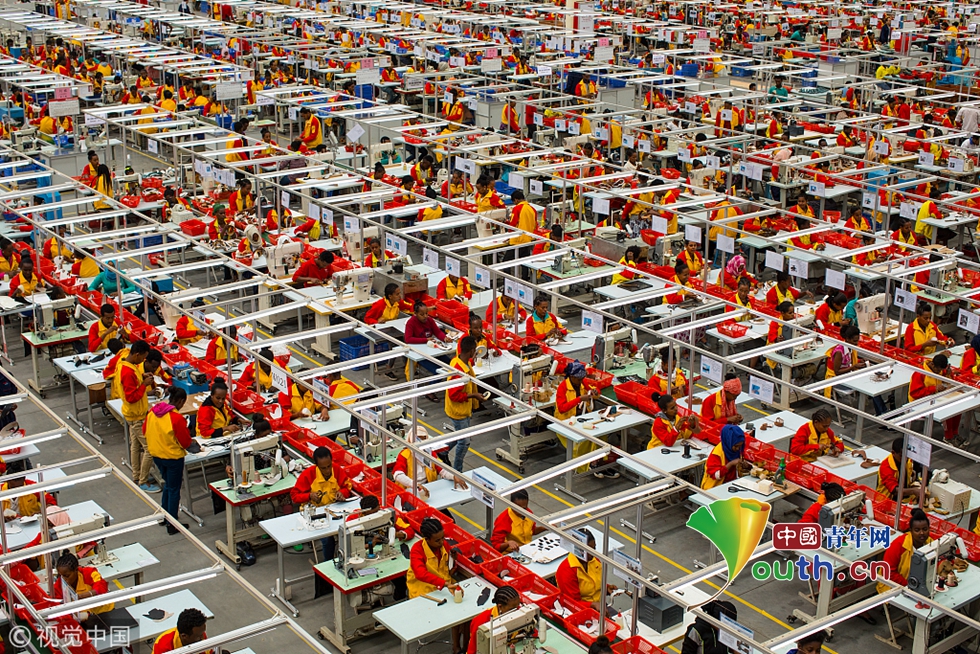 當(dāng)?shù)貢r(shí)間2018年8月1日,埃塞俄比亞。埃塞俄比亞首都亞的斯亞貝巴南部郊外,有一座東方工業(yè)園,這是中國(guó)在埃塞俄比亞的首個(gè)國(guó)家級(jí)境外經(jīng)貿(mào)合作區(qū)。園區(qū)占地5平方公里,連接著兩個(gè)60萬(wàn)人口的城鎮(zhèn),目前已經(jīng)有85家企業(yè)入駐,行業(yè)涉及紡織、服裝、制鞋、鋼筋、水泥、制藥、汽車(chē)組裝等,這些企業(yè)絕大部分來(lái)自中國(guó)。圖為鞋廠工人在2015年啟用的新廠區(qū)內(nèi)工作。