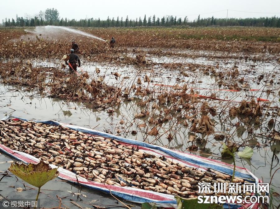 2018年10月14日,江蘇宿遷,泗洪縣曹廟鄉(xiāng)瓦廟村村民在藕蝦共作基地參加挖藕比賽。