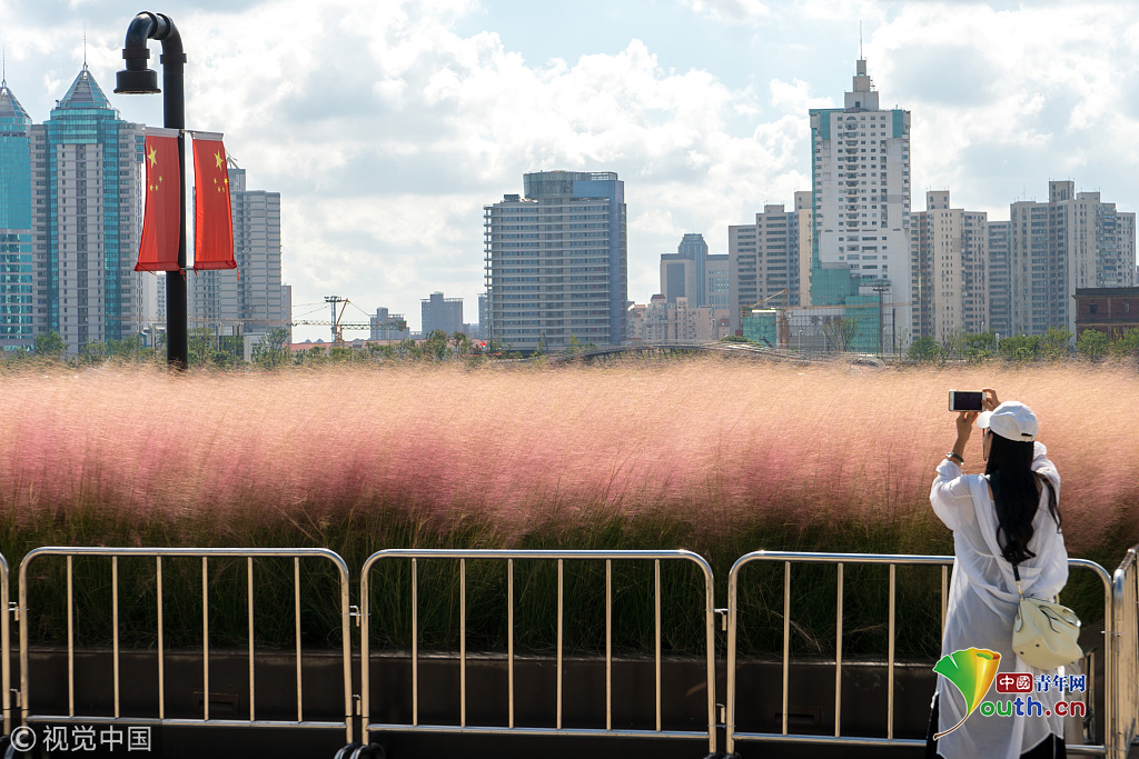 2018年9月28日,上海,東外灘楊浦濱江的粉黛亂子草目前已進入盛花期,當(dāng)日早間,不少市民來到濱江拍照賞景,成片的紫色花海在藍天白云映襯下美不勝收。圖片作者:王岡/視覺中國
