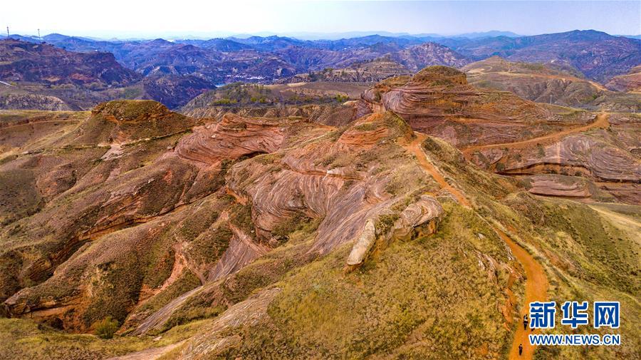 在黃土高原的陜西省延安市安塞區(qū)坪橋鎮(zhèn)王家灣,有一處峽谷丹霞地貌,是2017年陜西省地質(zhì)調(diào)查院在陜北及渭北地區(qū)發(fā)現(xiàn)大規(guī)模丹霞地貌的一部分。這里的山勢頂部被黃土覆蓋,底部經(jīng)流水下切侵蝕紅色砂巖外露,出露的巖石紋理如波浪,深秋中猶如一幅流動(dòng)的畫卷。