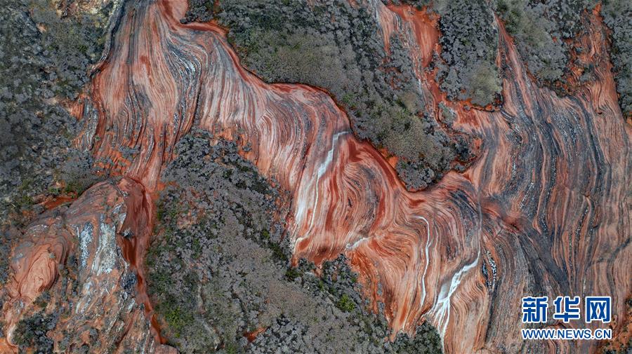 在黃土高原的陜西省延安市安塞區(qū)坪橋鎮(zhèn)王家灣,有一處峽谷丹霞地貌,是2017年陜西省地質(zhì)調(diào)查院在陜北及渭北地區(qū)發(fā)現(xiàn)大規(guī)模丹霞地貌的一部分。這里的山勢頂部被黃土覆蓋,底部經(jīng)流水下切侵蝕紅色砂巖外露,出露的巖石紋理如波浪,深秋中猶如一幅流動的畫卷。