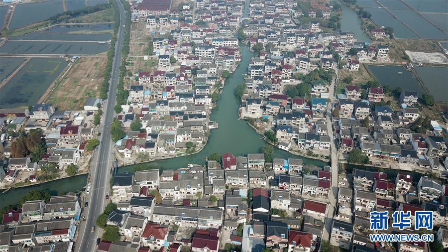 開弦弓村村貌(10月23日無人機拍攝)。小清河穿村而過,從高空俯瞰,南村河道像張弓,北村河道像支箭,村名由此而來。 新華社記者 季春鵬攝