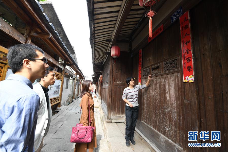 10月27日,琴江滿族村游客服務中心的鄭閩瓊(右一)向游客介紹三江口清朝水師旗營古兵房建筑特色。福州市長樂區(qū)琴江滿族村是福建省唯一的滿族聚居村,也是我國東南沿海保存較為完整的清代水師城堡。清雍正六年(1728年)時,清政府在此建立“福州三江口水師旗營”,鎮(zhèn)守閩江口,拱衛(wèi)省城,緝捕海盜,打擊走私。這里成為當時全國四大水師旗營之一,隨后逐漸成為一個居民小鎮(zhèn)。有近300年歷史的琴江村既有軍事歷史背景,又有民族文化特色,2010年成為“中國歷史文化名村”。新華社記者 林善傳 攝