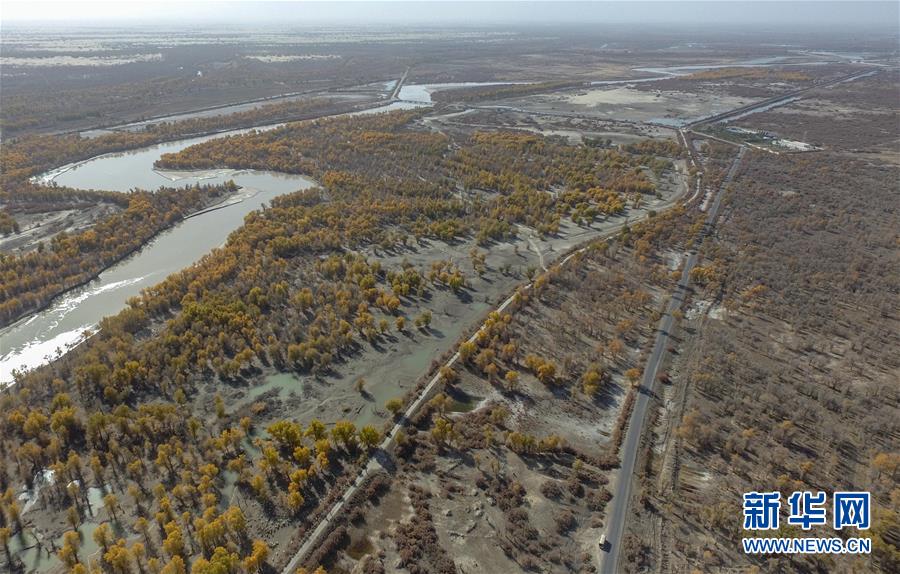 從空中俯瞰新疆尉犁縣喀爾曲尕鄉(xiāng),兩條道路沿著塔里木河岸邊的金色胡楊向前延伸(10月25日無人機拍攝)。 10月中下旬,靜靜的塔里木河中下游一片金黃。胡楊深處,條條小路蜿蜒綿長通向遠方,引人入勝。 塔里木河是中國最長的內陸河,這一區(qū)域原始胡楊林分布較為集中。隨著塔里木河連續(xù)19次向下游生態(tài)輸水,為胡楊林“解渴”,塔河兩岸生態(tài)得到明顯改善,沙地面積逐年減少。 新華社記者趙戈攝