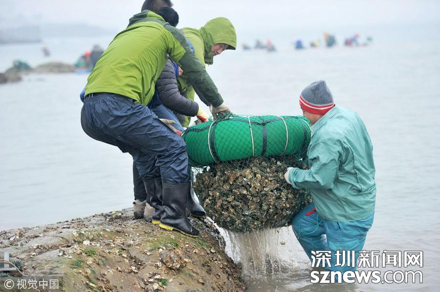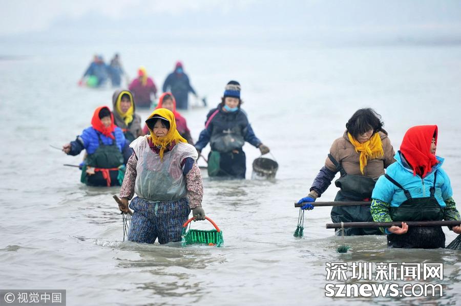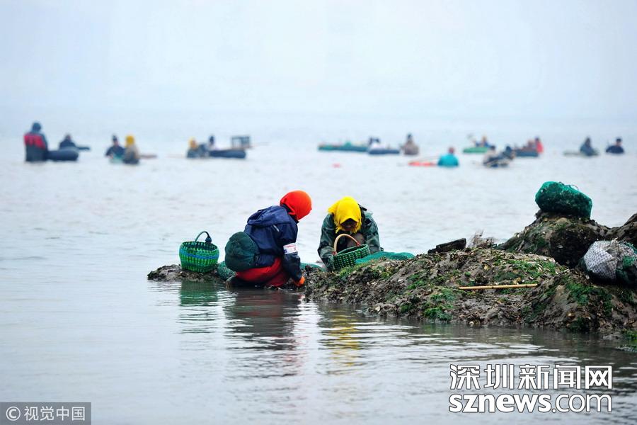 2018年12月22日,山東青島西海岸新區(qū)唐島灣南岸,市民蹚過海水帶回灣底挖到的海蠣子。
