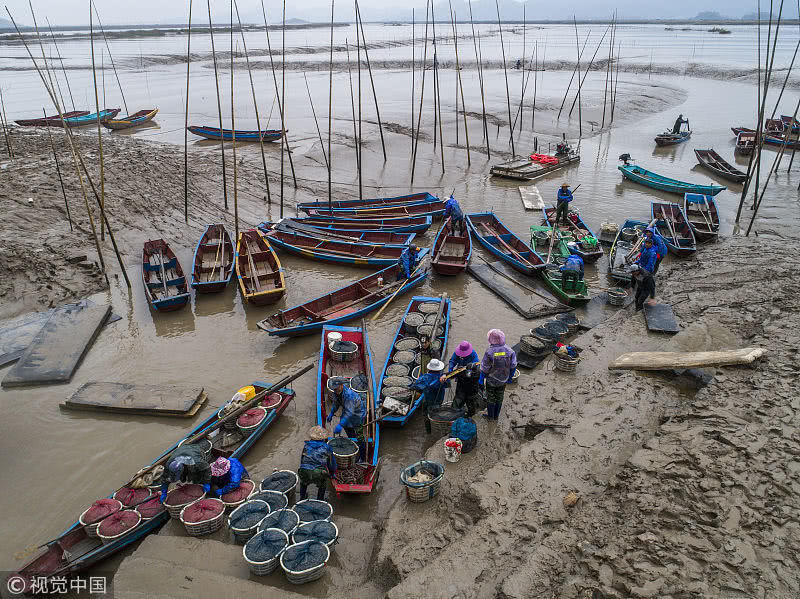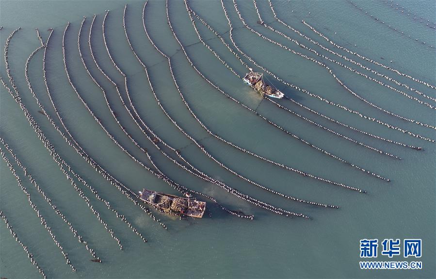 9月23日,漁民在捕撈牡蠣(無人機拍攝)。新華社記者龍雷攝
