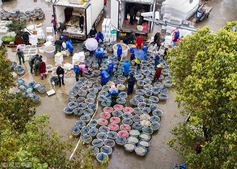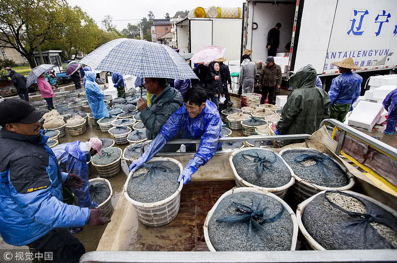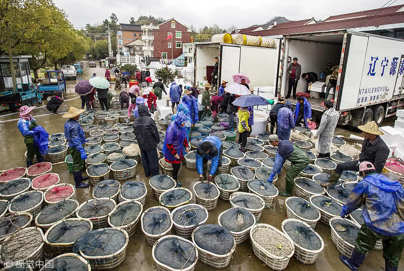浙江臺州,三門縣花橋鎮(zhèn)柵下村的文化禮堂前,村民們冒雨和商販交易蟶苗,現(xiàn)場一片繁忙。據(jù)了解,花橋蟶苗屬于野生苗,存活率高,易成長,極受市場歡迎,一到捕撈季節(jié),遼寧、山東、江蘇和浙江的養(yǎng)殖戶和蟶苗小販爭相到花橋購買優(yōu)質蟶苗。