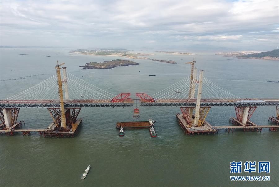 9月21日,平潭海峽公鐵大橋鼓嶼門航道橋鋼桁梁被架梁起重機(jī)穩(wěn)穩(wěn)地提升起來(無人機(jī)拍攝)。新華社記者林善傳攝