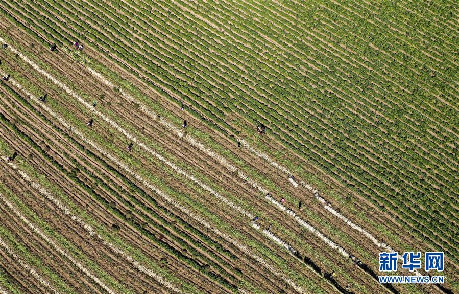 9月30日,寧夏吳忠市紅寺堡區(qū)馬渠生態(tài)移民安置區(qū)的農(nóng)民在蘿卜地里勞作(無(wú)人機(jī)拍攝)。