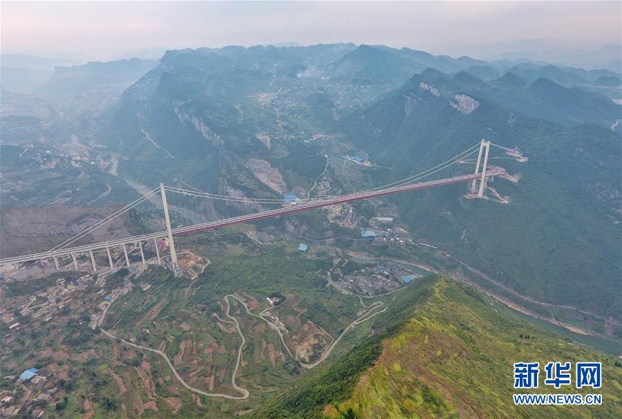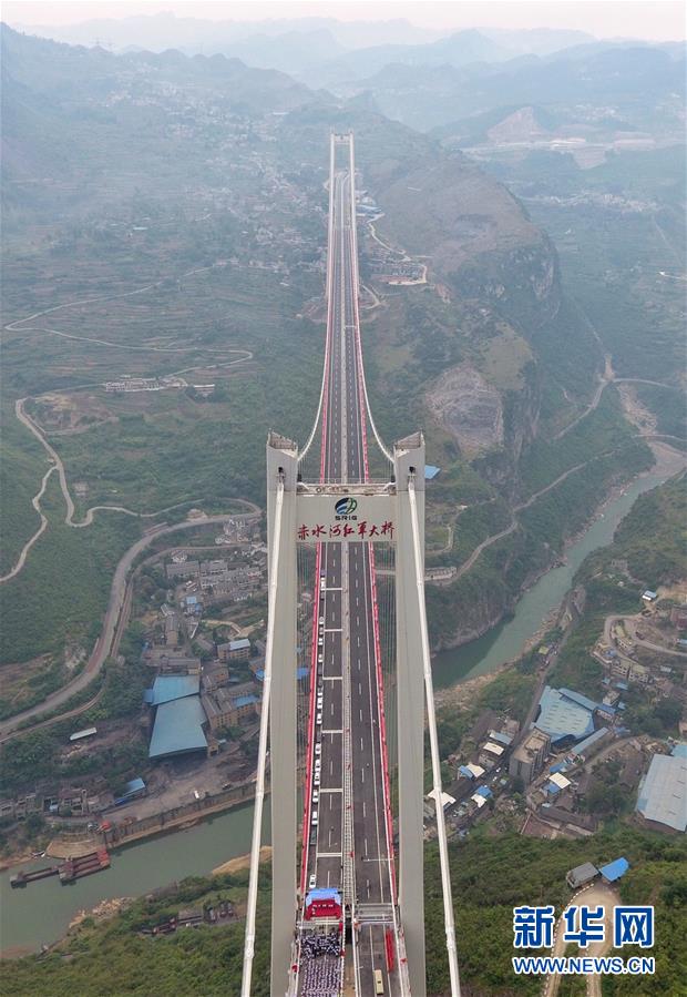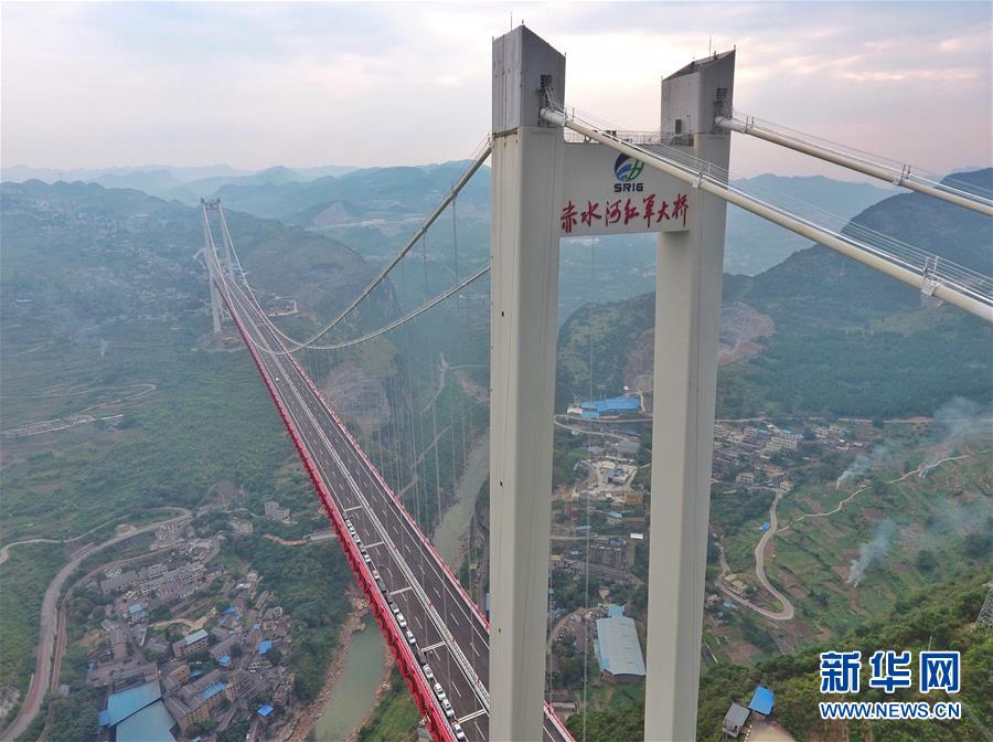 赤水河紅軍大橋全長(zhǎng)2009米,主跨1200米,主塔高243.5米,在全國(guó)山區(qū)同類型鋼桁梁懸索橋梁中排名前列,由四川省鐵投集團(tuán)投資、四川路橋集團(tuán)承建,于2017年上半年開工。 新華社記者劉坤攝