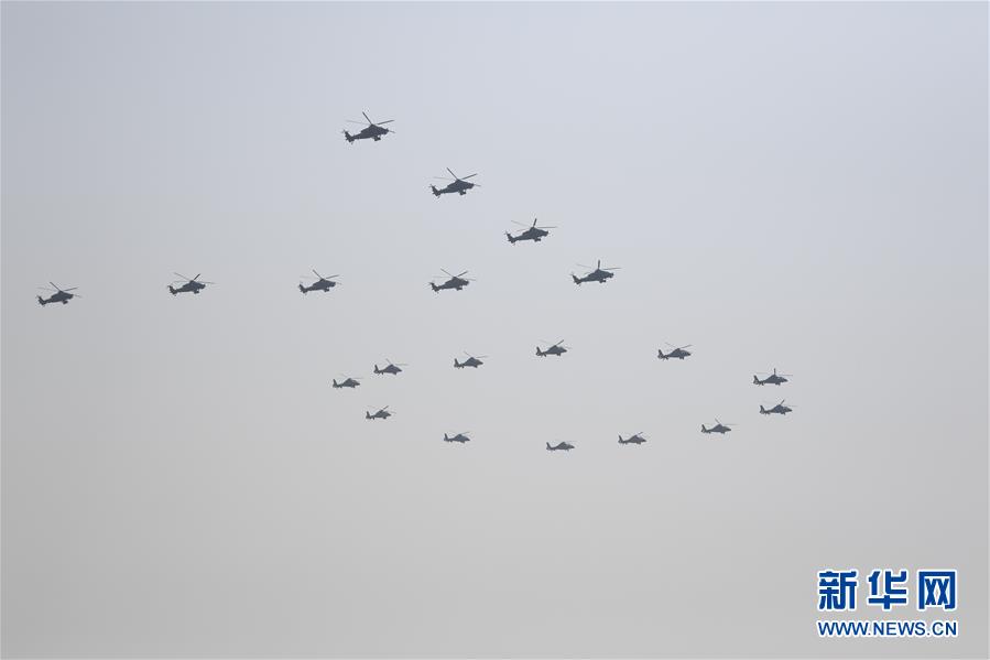 10月1日上午,慶祝中華人民共和國(guó)成立70周年大會(huì)在北京天安門(mén)廣場(chǎng)隆重舉行。這是20架直升機(jī)在空中組成“70”字樣。新華社記者王凱攝