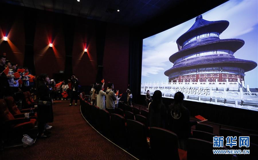 9月30日,在美國洛杉磯,觀眾在電影《我和我的祖國》當?shù)厥子扯Y上合唱同名主題歌。新華社記者李穎攝