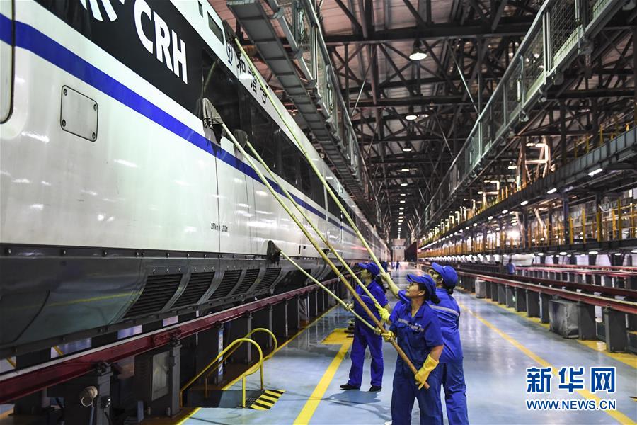 工人們?cè)谀蠈巹?dòng)車所檢查庫內(nèi)擦洗車輛(10月2日攝)。 國慶長假期間,動(dòng)車、高鐵開行密度較平時(shí)有所增加。當(dāng)夜幕降臨,隨著一列列結(jié)束運(yùn)營的動(dòng)車、高鐵陸續(xù)返回,中國鐵路南寧局集團(tuán)有限公司南寧車輛段南寧動(dòng)車所檢查庫里的地勤機(jī)械師們也變得忙碌起來,他們像醫(yī)生一樣對(duì)列車進(jìn)行全方位檢修保養(yǎng),確保車輛第二天可以正常運(yùn)行。 新華社記者 曹祎銘 攝