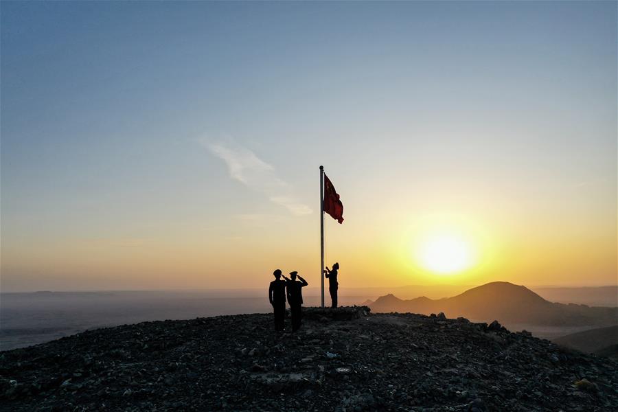 9月27日,內(nèi)蒙古自治區(qū)額濟(jì)納旗算井子邊境派出所民警在大紅山上舉行升國旗儀式(無人機(jī)拍攝)。新華社記者劉磊攝