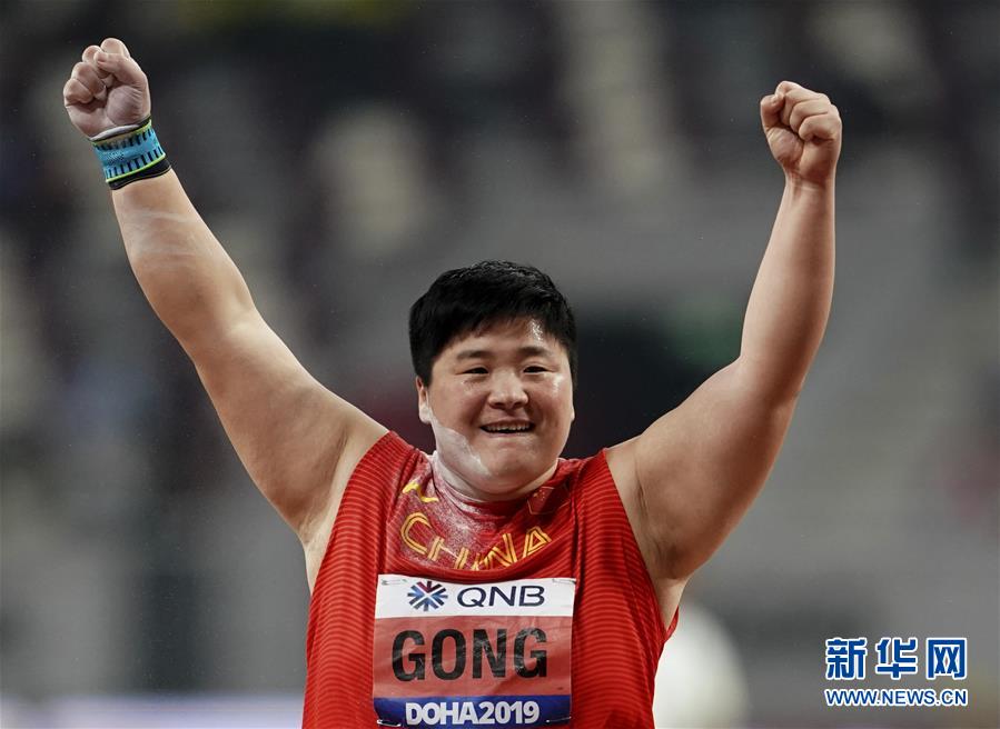 當(dāng)日,在卡塔爾多哈舉行的2019國際田聯(lián)世界田徑錦標(biāo)賽女子鉛球決賽中,衛(wèi)冕冠軍、中國選手鞏立姣以19米55的成績奪得冠軍。 新華社記者賈宇辰攝