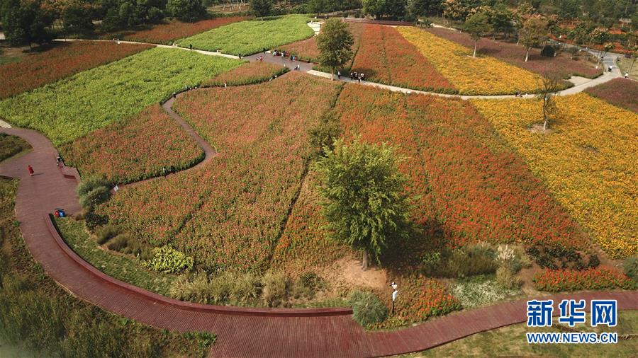 10月9日無人機(jī)拍攝的四季花海城市公園風(fēng)景。 秋日時(shí)節(jié),位于安徽省合肥市的四季花海城市公園花香四溢,色彩繽紛,成為游客和市民休閑游玩的好去處。 新華社記者 張端 攝