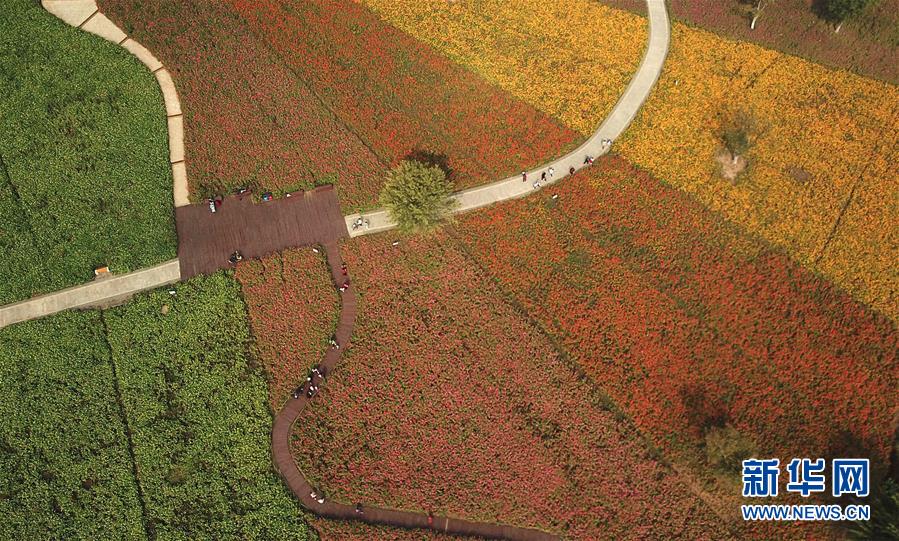 10月9日,游人在四季花海城市公園游覽(無人機(jī)拍攝)。 秋日時(shí)節(jié),位于安徽省合肥市的四季花海城市公園花香四溢,色彩繽紛,成為游客和市民休閑游玩的好去處。 新華社記者 張端 攝