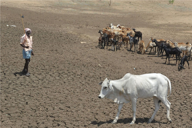 當(dāng)?shù)貢r(shí)間2017年5月30日,印度特倫甘納,印度農(nóng)民在干涸的河床上放羊和牛。NOAH SEELAM/視覺中國(guó) 編輯/陳進(jìn)