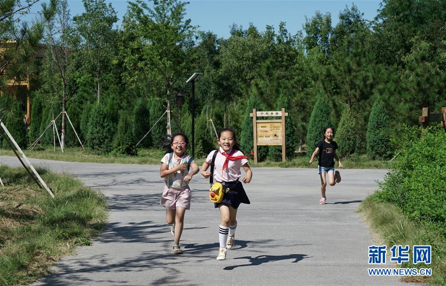 小學(xué)生們在千年秀林內(nèi)玩耍(8月29日攝)。新華社記者牟宇攝