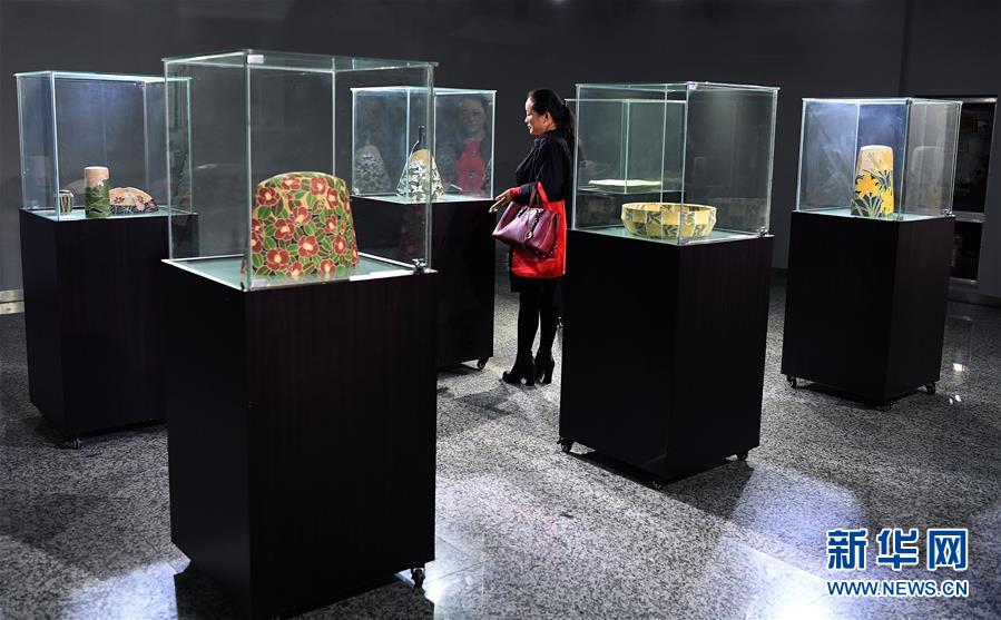 參觀者在江西景德鎮(zhèn)美術館參觀“笠間燒”日本陶藝家的作品展(2018年10月19日攝)。新華社記者 萬象 攝