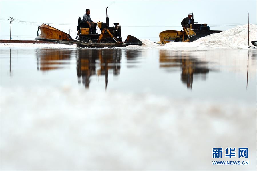 魯北鹽場(chǎng)工人在鹽池中收獲海鹽(10月9日攝)。新華社記者 朱崢 攝
