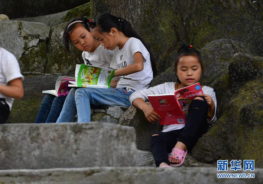 黔桂烏英苗寨的孩子們?cè)陂喿x剛剛獲贈(zèng)的圖書(shū)(10月11日攝)。